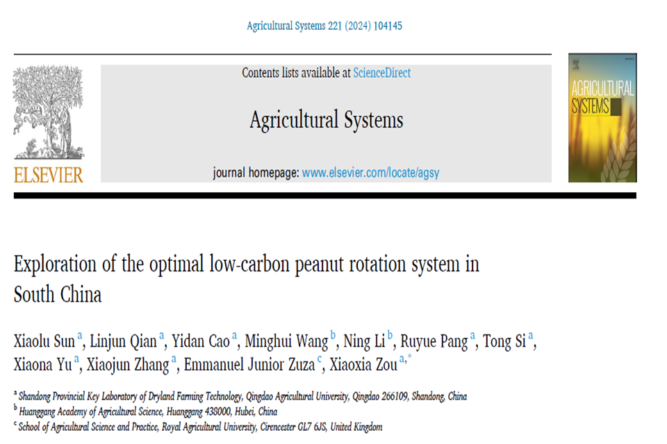 近日,国际知名期刊《Agricultural Systems》(中国科学院农林科学一区,影响因子6.1)在线发表了beat365在线唯一官网花生中心团队完成的题为“Exploration of the optimal low-carbon peanut rotation system in South China”的研究成果。该论文第一通讯单位为beat365在线唯一官网,beat365在线唯一官网讲师孙筱璐为第一作者,邹晓霞教授为通讯作者。