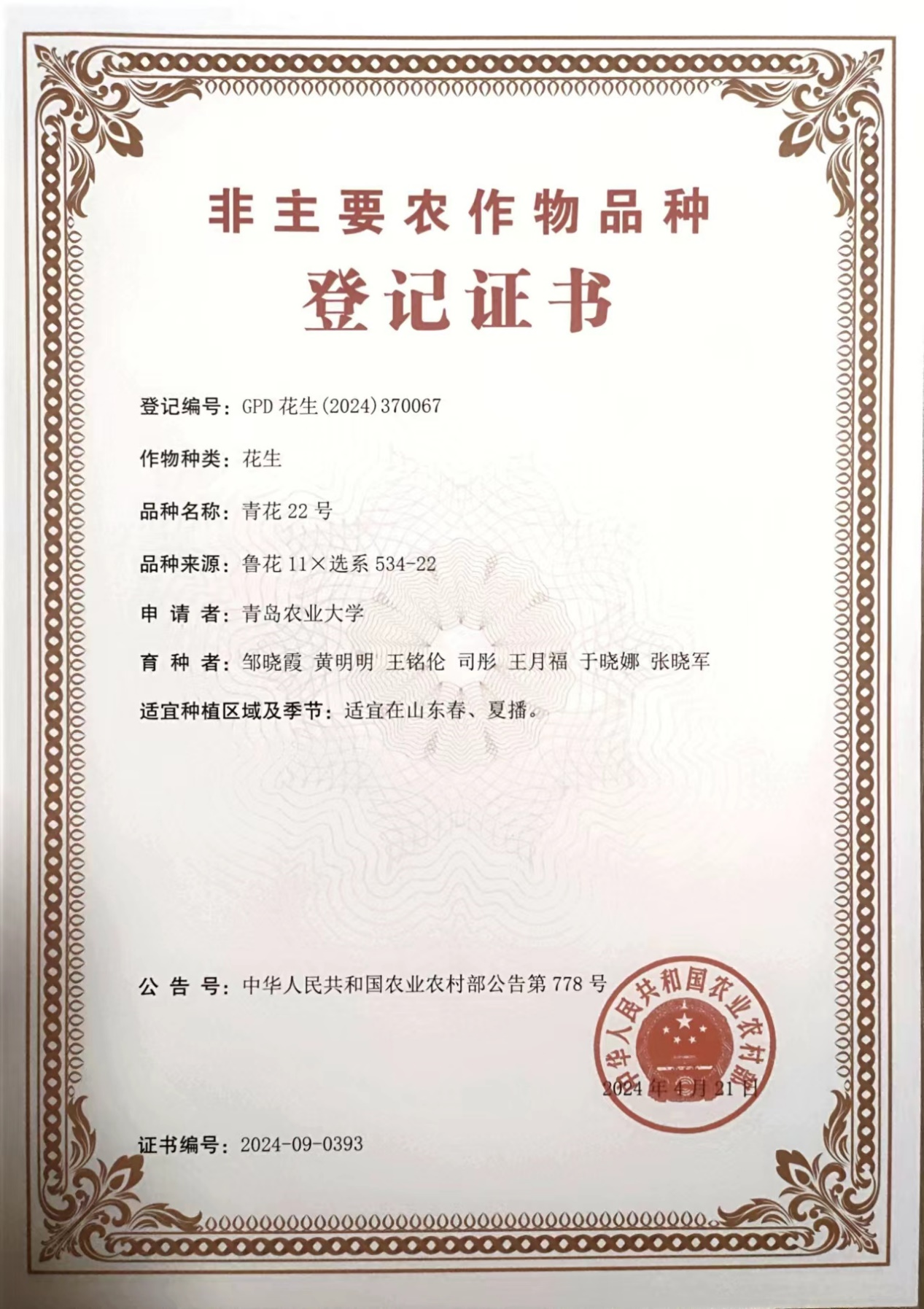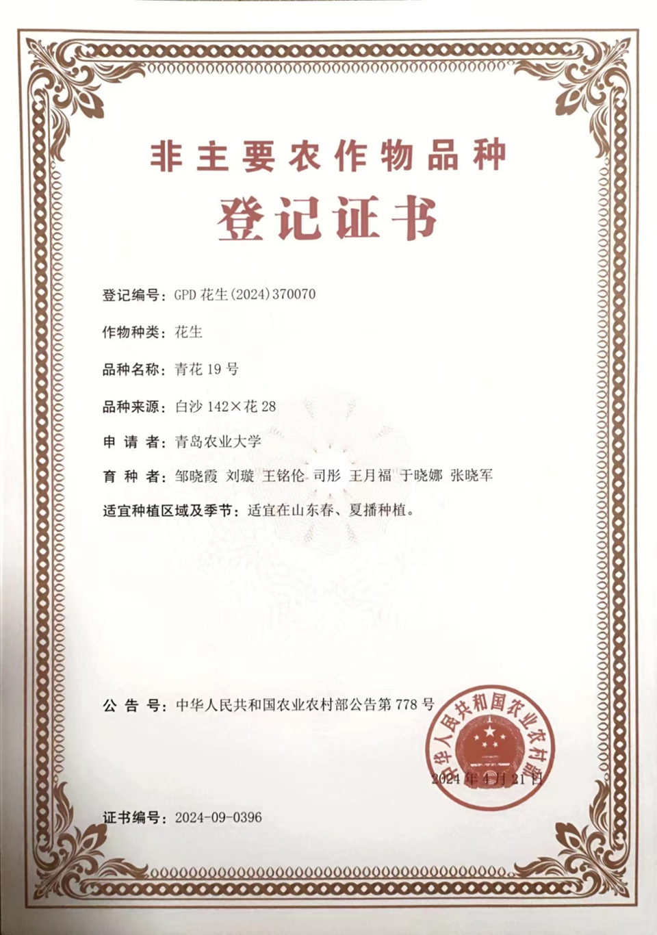 该项目负责人为beat365在线唯一官网教授、国家花生产业技术体系岗位科学家邹晓霞。据介绍,青花19号由白沙142和花28通过有性杂交、系统选育而成,属于油食兼用型花生。生育期120天左右,荚果珍珠豆形,百仁重约110克,出仁率可达77%。品种适应性广、抗逆性强。在2021和2022两年区试试验分别比对照增产9.25%和7.58%。此前,团队培育了花生品种青花6号,于2012年通过国家鉴定,近几年在东北、河南、山东等地种植面积大,品种市场认可度和需求度高。青花19号是在青花6号基础上进一步选育的罗汉果型大花生,在进一步提升产量基础上,保留了青花6号的抗逆、早熟优良品性。青花22号由鲁花11和选系534-22通过有性杂交、系统选育而成,属于出口型大花生品种。生育期124天左右,荚果普通形,典型特点是高产、大果、大仁,百果重254克,出仁率74.5%。在2021和2022两年区试试验分别比对照增产15.64%和14.35%。