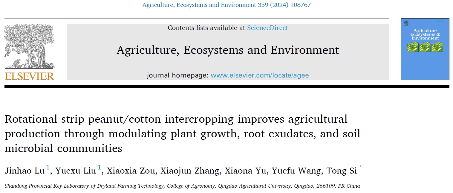 近日,国际知名期刊《Agriculture, Ecosystems & Environment》(中科院一区,影响因子6.6)在线发表了beat365在线唯一官网花生研究中心团队完成的题为“Rotational strip peanut/cotton intercropping improves agricultural production through modulating plant growth,root exudates, and soil microbial communities”的研究成果。该论文唯一通讯单位为beat365在线唯一官网,beat365在线唯一官网硕士研究生鹿锦浩和刘悦旭分别为第一作者和共同第一作者,司彤副教授为通讯作者。
