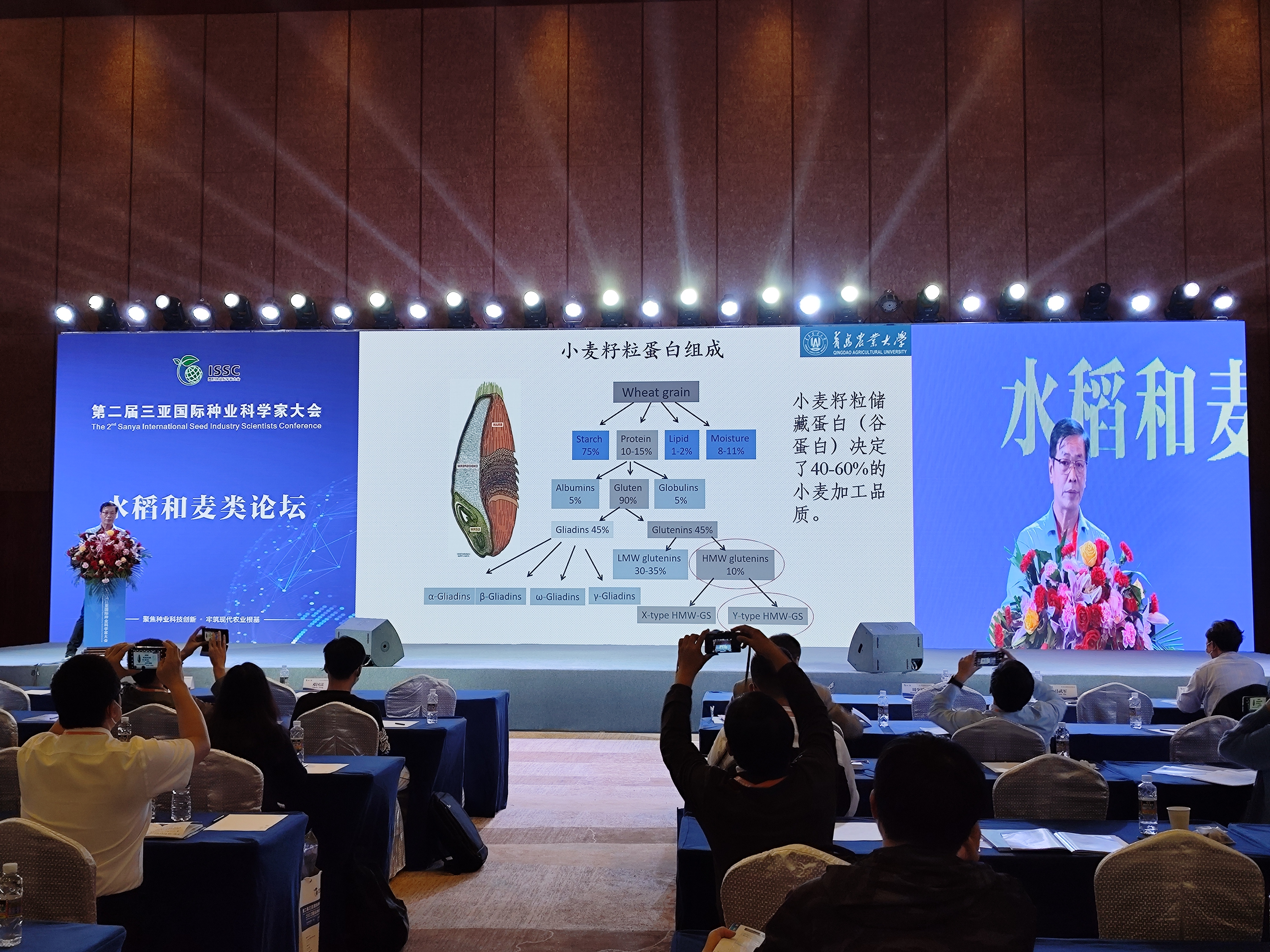 本届大会的主题为“聚焦种业科技创新,牢筑现代种业根基”,会议期间举办了领袖峰会、玉米与生物技术论坛、水稻和麦类论坛及2022国际种业科技博览会等多场论坛会议及活动。此次大会,共有三十余名中外院士、1700余名代表参会。马武军受邀在水稻和麦类论坛作了题为“小麦品质产量协同提高的机理解析”的精彩报告,针对长期困扰小麦育种界兼具优质、高产的理论“瓶颈”问题,运用包含遗传、栽培、代谢组学、蛋白质组学、基因组学等多重策略,历时8年,成功解析小麦产量和品质同步提高的调控网络,使得小麦产量和品质同步提高成为可能,报告吸引了领域内众多学者和相关企业的广泛关注。