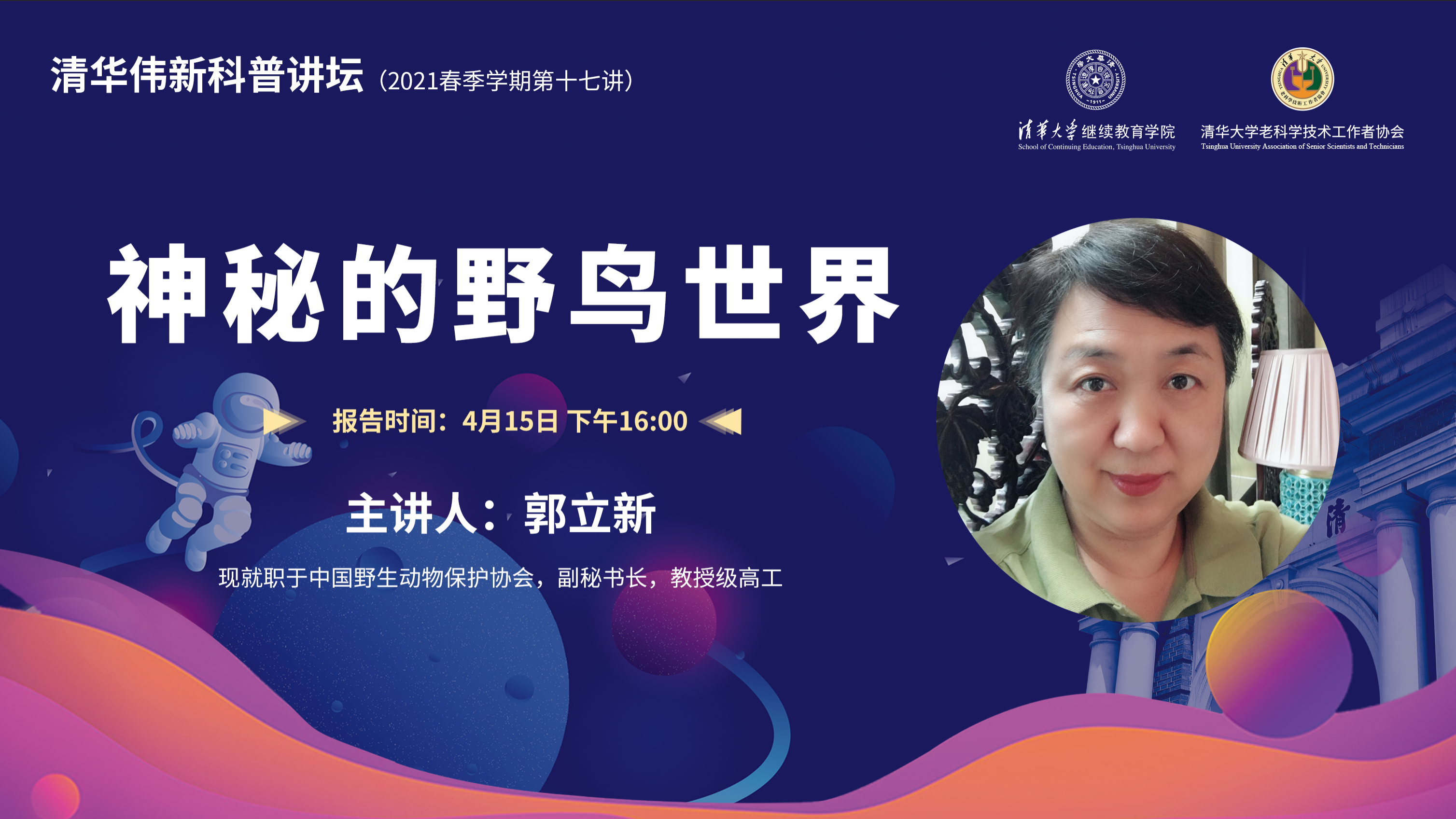4月15日下午,清华伟新科普讲坛第十七讲通过雨课堂在线开讲。讲坛由香港伟新教育基金提供支持。本讲由中国野生动物保护协会,副秘书长,教授级高工郭立新讲授“神秘的野鸟世界”。来自17个省40个县区的万象城娱乐awc线路乡村振兴远程教学站所在地学校师生共计26万余人参加学习。