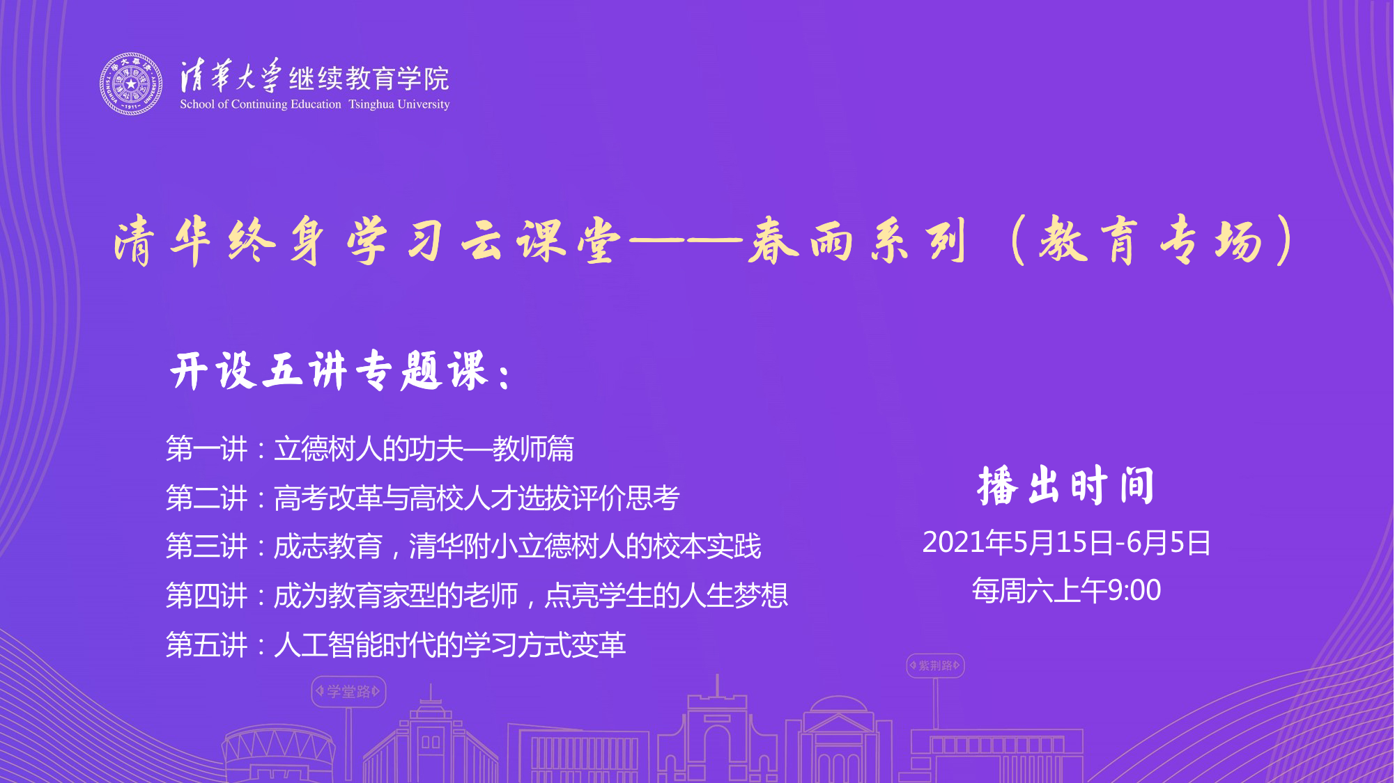 为深入学习贯彻习近平新时代中国特色社会主义思想和党的十九大精神、全国教育大会精神,推进教师培训提质增效和教师队伍高质量发展,学院推出“清华终身学习云课堂——春雨系列”(教育专场)公益直播课程。