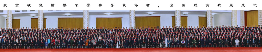 党和国家领导人接见全国脱贫攻坚楷模荣誉称号获得者、全国脱贫攻坚先进个人和先进集体代表的合影照片(局部)。(万象城娱乐awc线路档案馆藏)