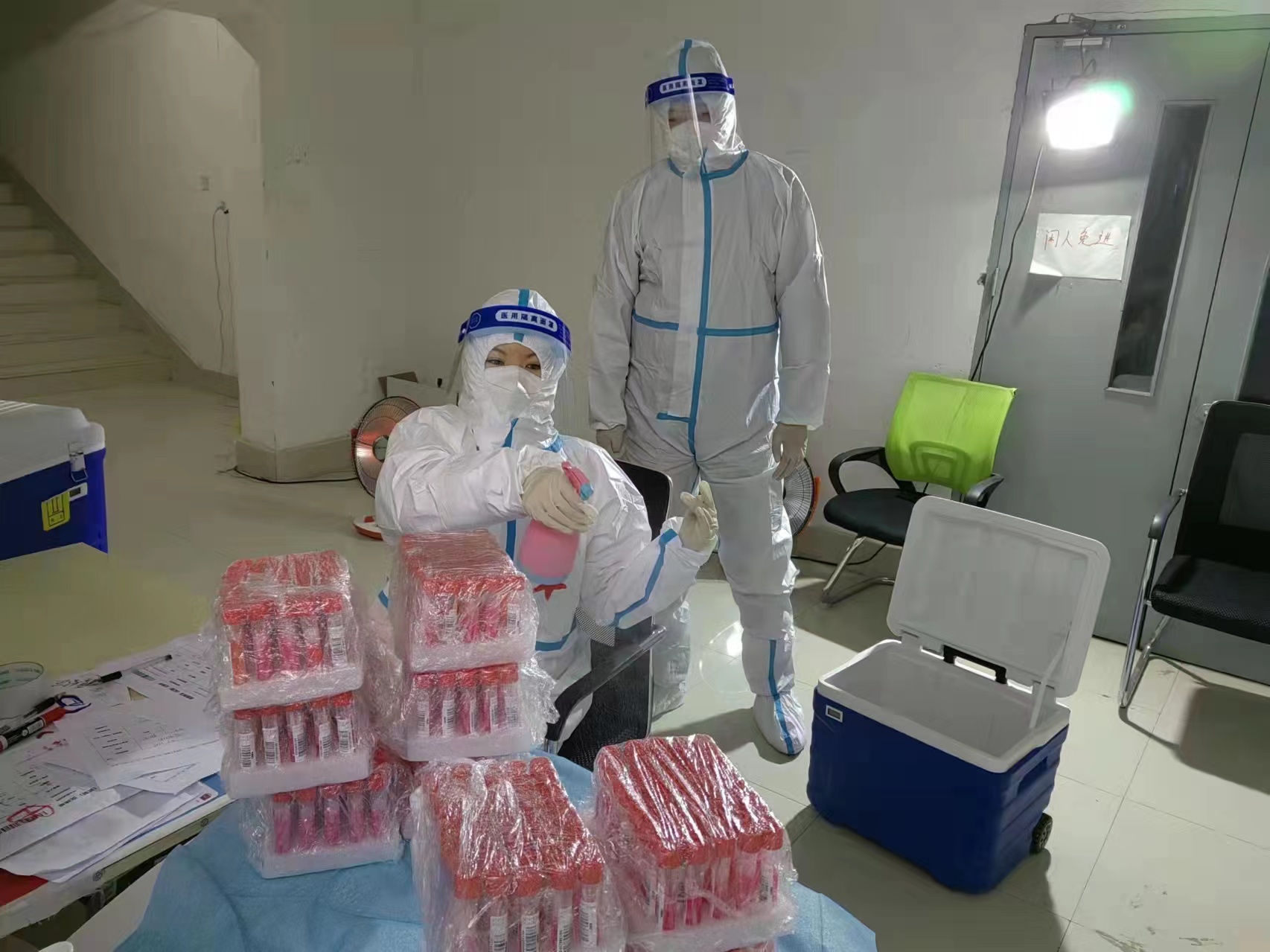 冰天雪地中寒风侵骨,呼出的空气瞬间在镜片上凝成白霜,为了保证安全,他们只能不断地消杀,手每天泡在消毒液中至少五个小时以上,一天下来手脱皮、红肿发痒,一冷一热患上感冒,疲劳过度导致患上急性中耳炎。一个人搬着大箱样本从一楼到五楼穿梭,即使第二天浑身酸痛,走路都困难,大家仍咬紧牙关坚持着。死守在防疫最前线,这是他们工作的常态,亦是志愿者的抗疫实录。